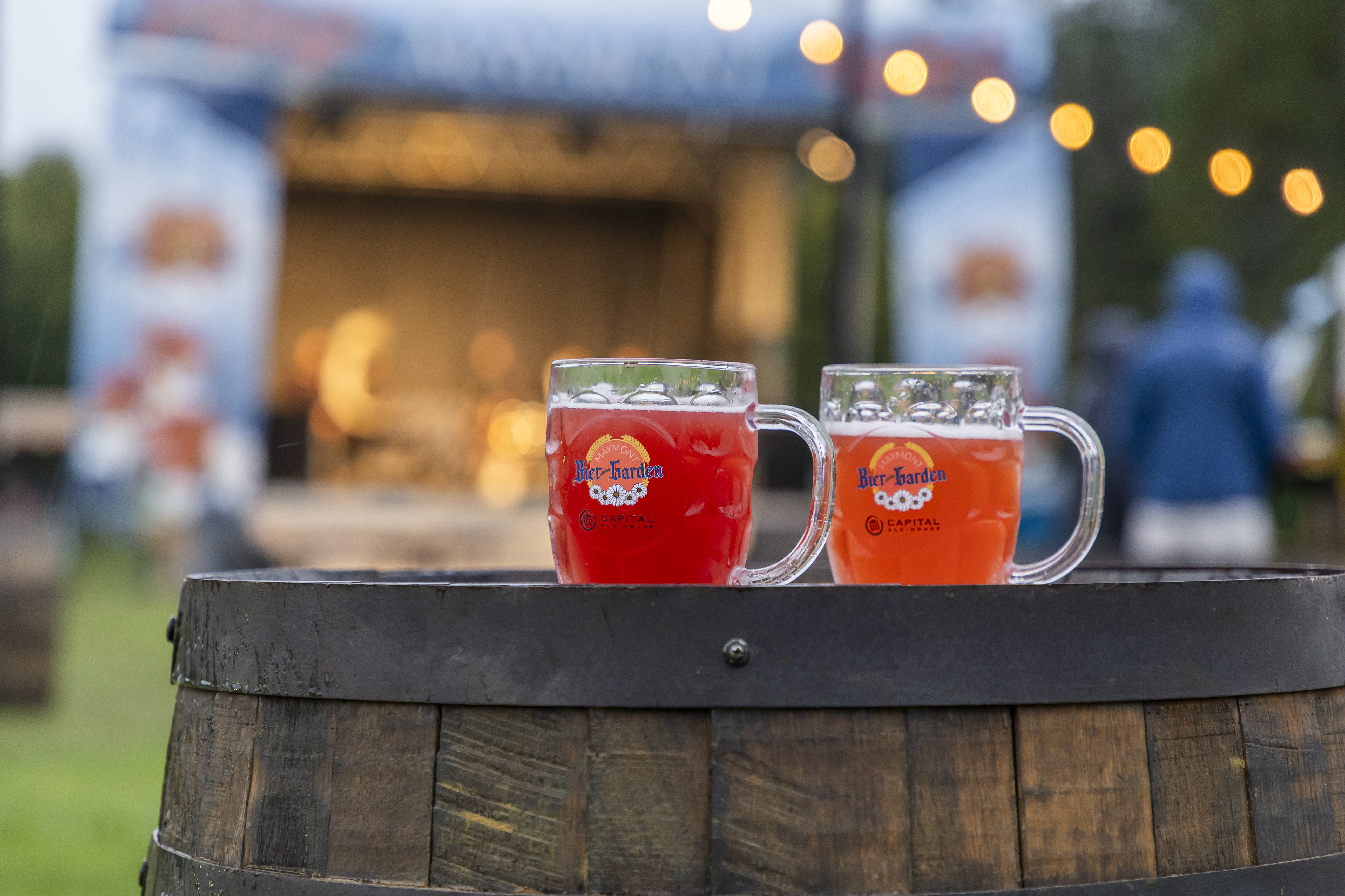 Two glass mugs with the Bier-Garden logo are full of a reddish beer, sitting on a barrel with a stage and lights in the background