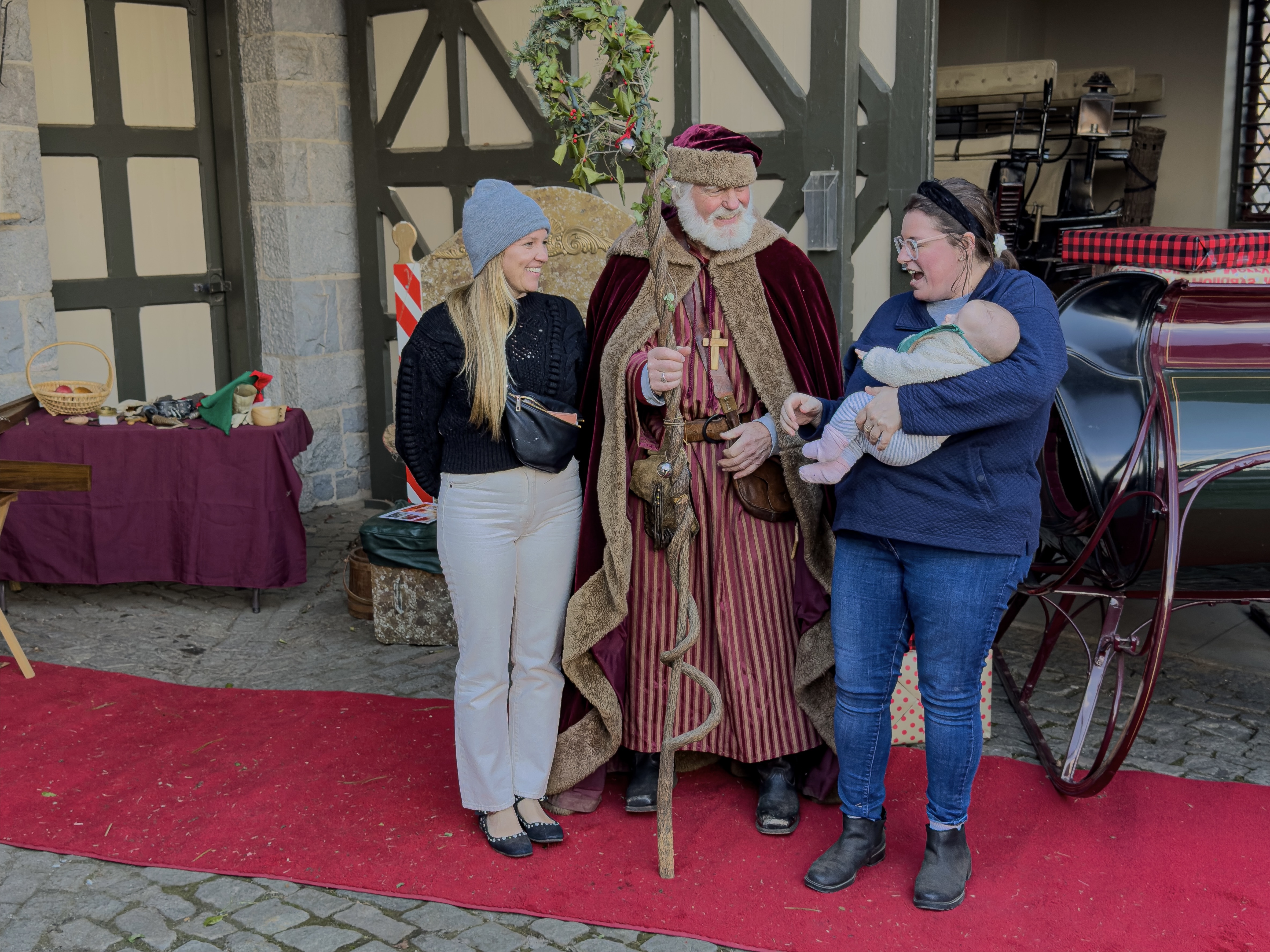 Two women stand with one baby while St. Nicholas nearby smiles at the baby, with an antique carriage in the background and a red carpet on cobblestones