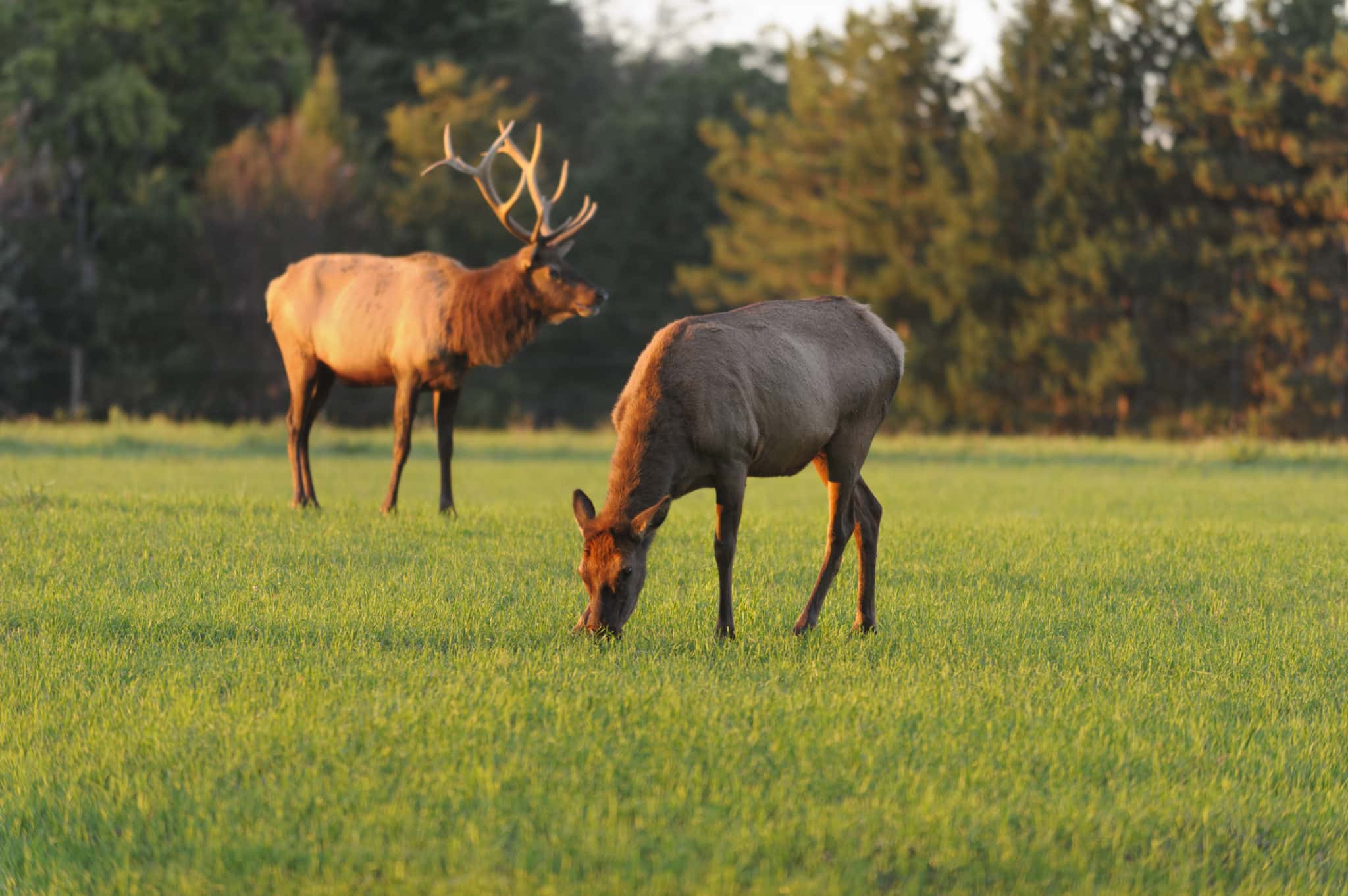 Elk Grazing At Sunset In Grassy Field, Benezette, PA, USA