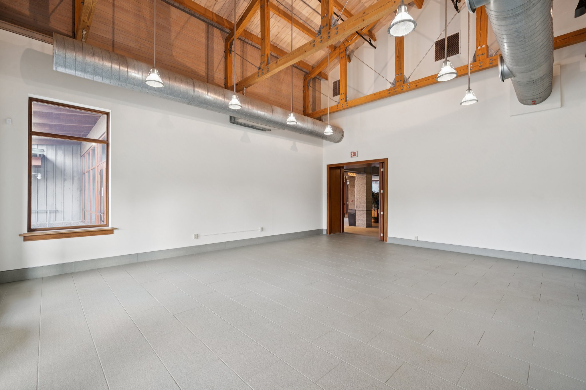 Indoor view of a room with high ceilings and exposed wooden beams.