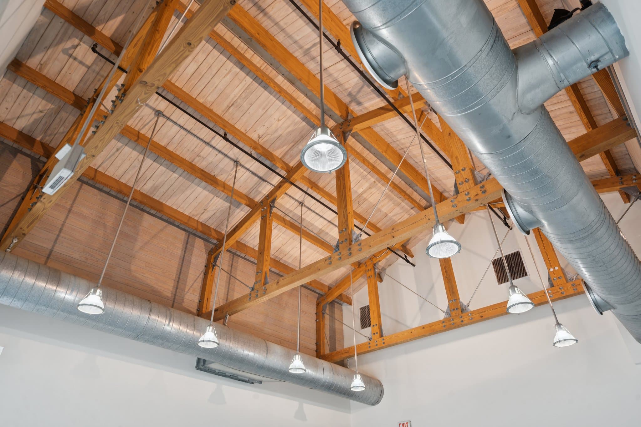 View of the exposed wooden beams and lighting as well as HVAC hanging in the ceiling.